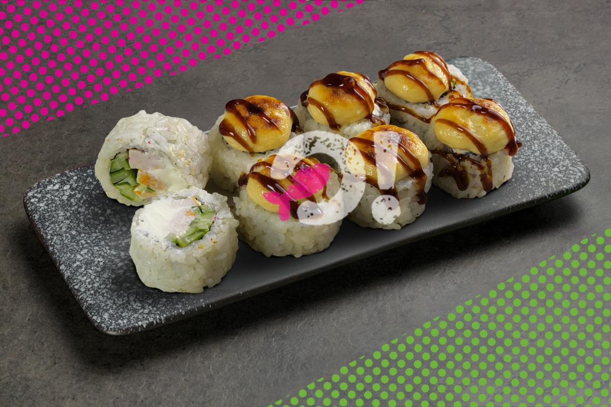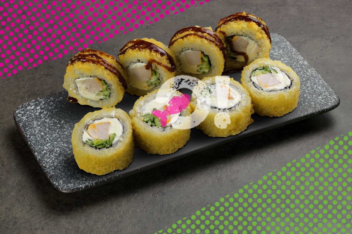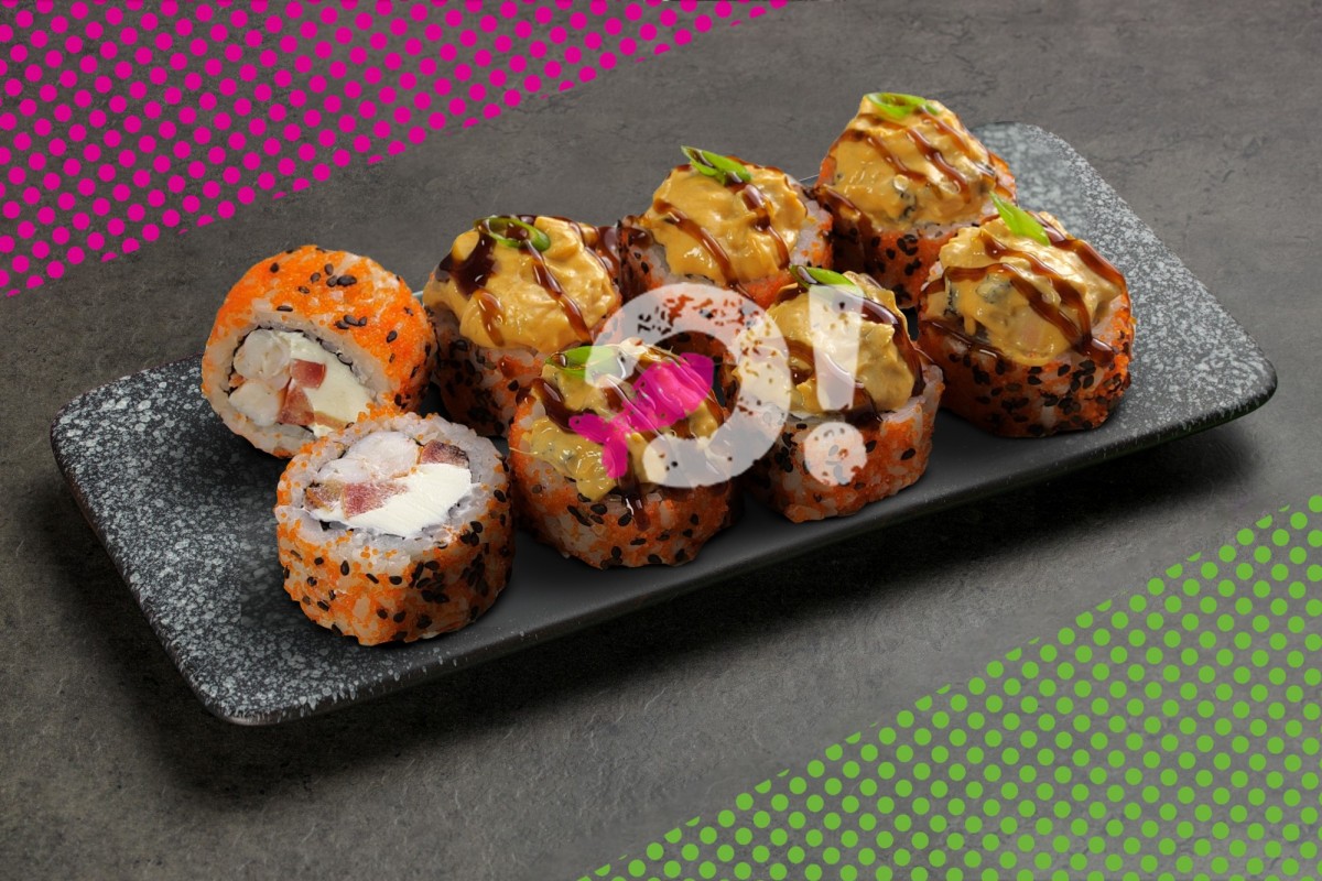 Мы решили объединить всеми любимые темпурные роллы с не менее любимыми спайси гунканами. Великолепный жареный ролл с начинкой из сливочного сыра и хрустящих огурчиков и вкуснейшей пикантной шапочкой с мягким и сочным гребешком, спайси соусом. Украшен зеленым луком и соусом унаги